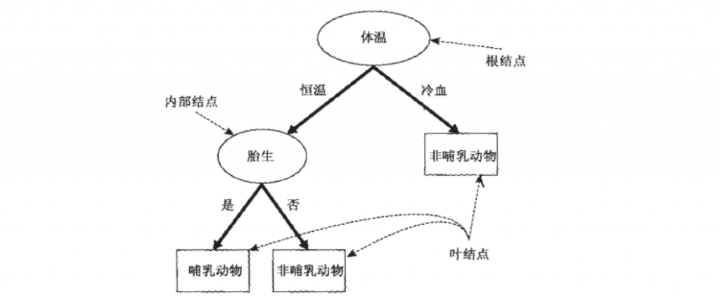 可以看出,在这个决策过程中,我们一直在对记录的特征进行提问。最初的问题所在的地方叫做根节点,在得到结论前的每一个问题都是中间节点,而得到的每一个结论(动物的类别)都叫做叶子节点。