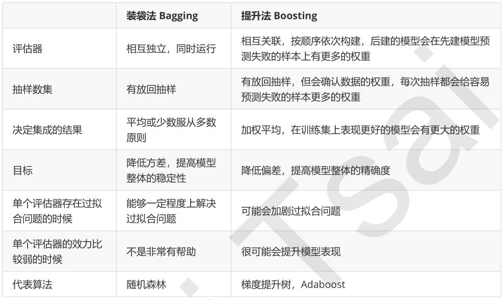 多个模型集成成为的模型叫做集成评估器(ensemble estimator),组成集成评估器的每个模型都叫做基评估器(base estimator)。通常来说,有三类集成算法:装袋法(Bagging),提升法(Boosting)和stacking。