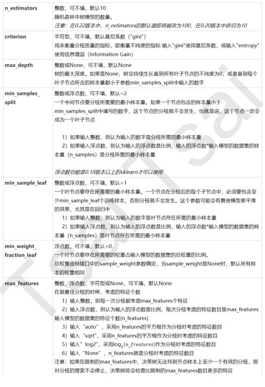 n_estimators的默认值在现有版本的sklearn中是10,但是在即将更新的0.22版本中,这个默认值会被修正为100。这个修正显示出了使用者的调参倾向:要更大的n_estimators。