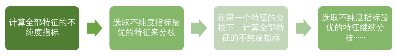 对于第一个问题,我们定义了用来衡量分枝质量的指标不纯度,分类树的不纯度用基尼系数或信息熵来衡量,回归树的不纯度用MSE均方误差来衡量。每次分枝时,决策树对所有的特征进行不纯度计算,选取不纯度最低的特征进行分枝,分枝后,又再对被分枝的不同取值下,计算每个特征的不纯度,继续选取不纯度最低的特征进行分枝。