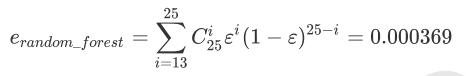 其中,i是判断错误的次数,也是判错的树的数量,ε是一棵树判断错误的概率,(1-ε)是判断正确的概率,共判对25-i次。采用组合,是因为25棵树中,有任意i棵都判断错误