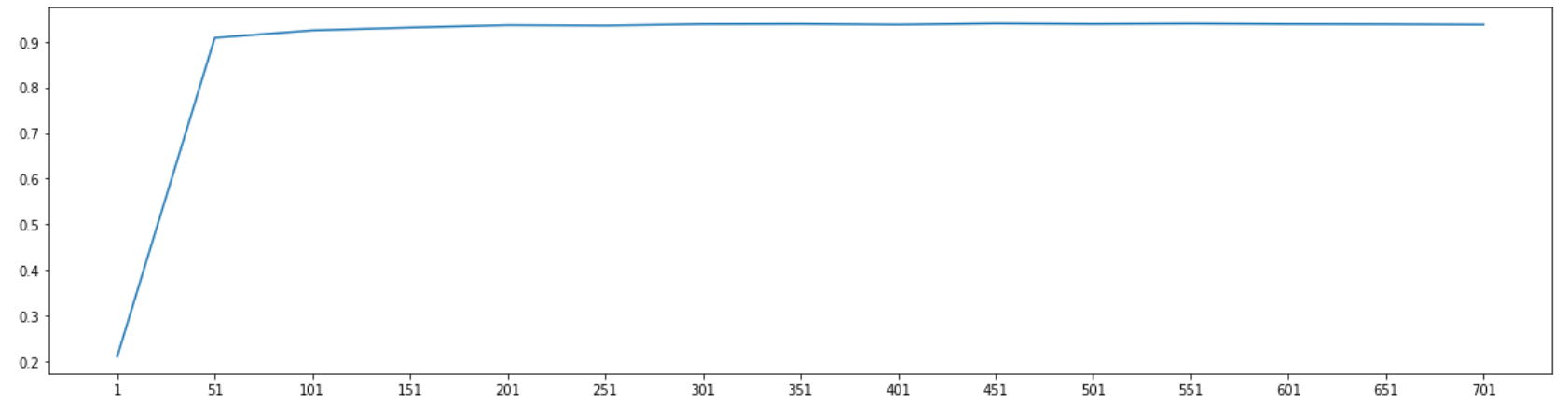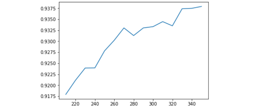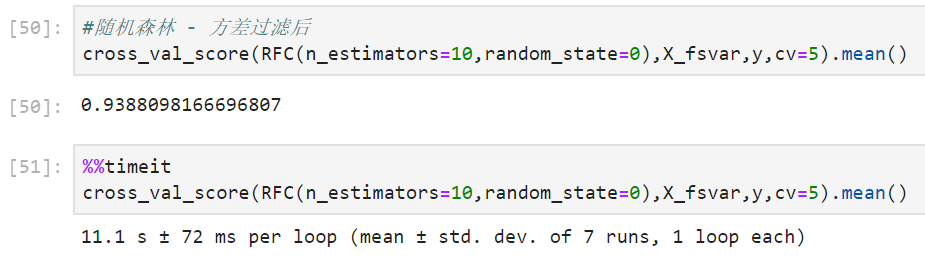 明显能够看出,在包装法下面,应用50个特征时,模型的表现就已经达到了90%以上,比嵌入法和过滤法都高效很多。我们可以放大图像,寻找模型变得非常稳定的点来画进一步的学习曲线(就像我们在嵌入法中做的那样)。如果我们此时追求的是最大化降低模型的运行时间,我们甚至可以直接选择50作为特征的数目,这是一个在缩减了94%的特征的基础上,还能保证模型表现在90%以上的特征组合,不可谓不高效。同时,我们提到过,在特征数目相同时,包装法能够在效果上匹敌嵌入法。试试看如果我们也使用340作为特征数目,运行一下,可以感受一下包装法和嵌入法哪一个的速度更加快。由于包装法效果和嵌入法相差不多,在更小的范围内使用学习曲线,我们也可以将包装法的效果调得很好,大家可以去试试看。