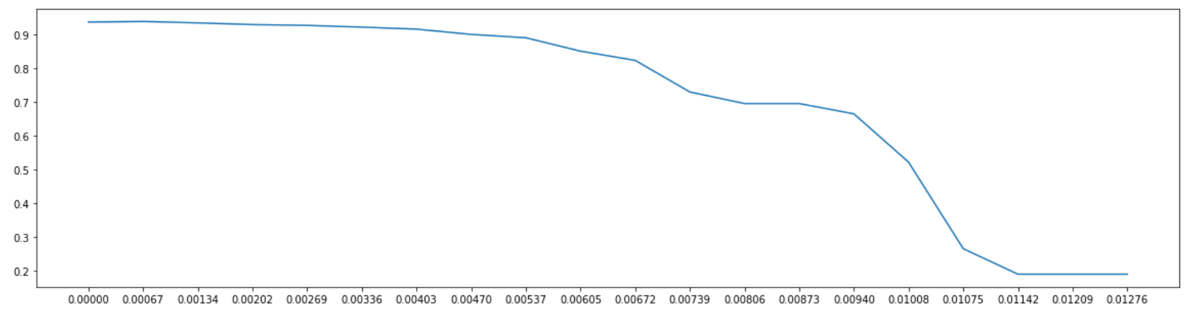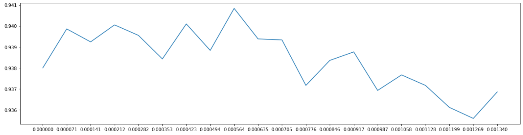 查看结果,果然0.00067并不是最高点,真正的最高点0.000564已经将模型效果提升到了94%以上。我们使用0.000564来跑一跑我们的SelectFromModel: