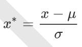 当数据(x)按均值(μ)中心化后,再按标准差(σ)缩放,数据就会服从为均值为0,方差为1的正态分布(即标准正态分布),而这个过程,就叫做数据标准化(Standardization,又称Z-score normalization),公式如下:
