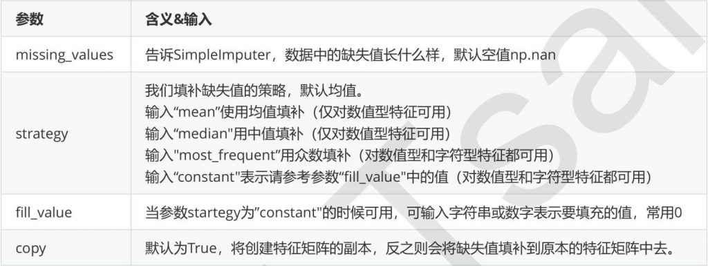 在讲解随机森林的案例时,我们用这个类和随机森林回归填补了缺失值,对比了不同的缺失值填补方式对数据的影响。这个类是专门用来填补缺失值的。它包括四个重要参数: