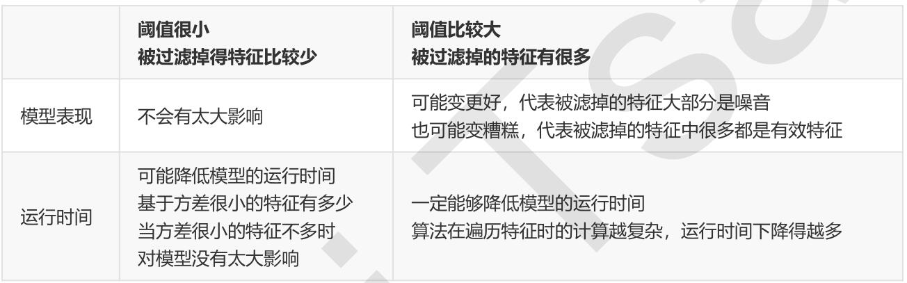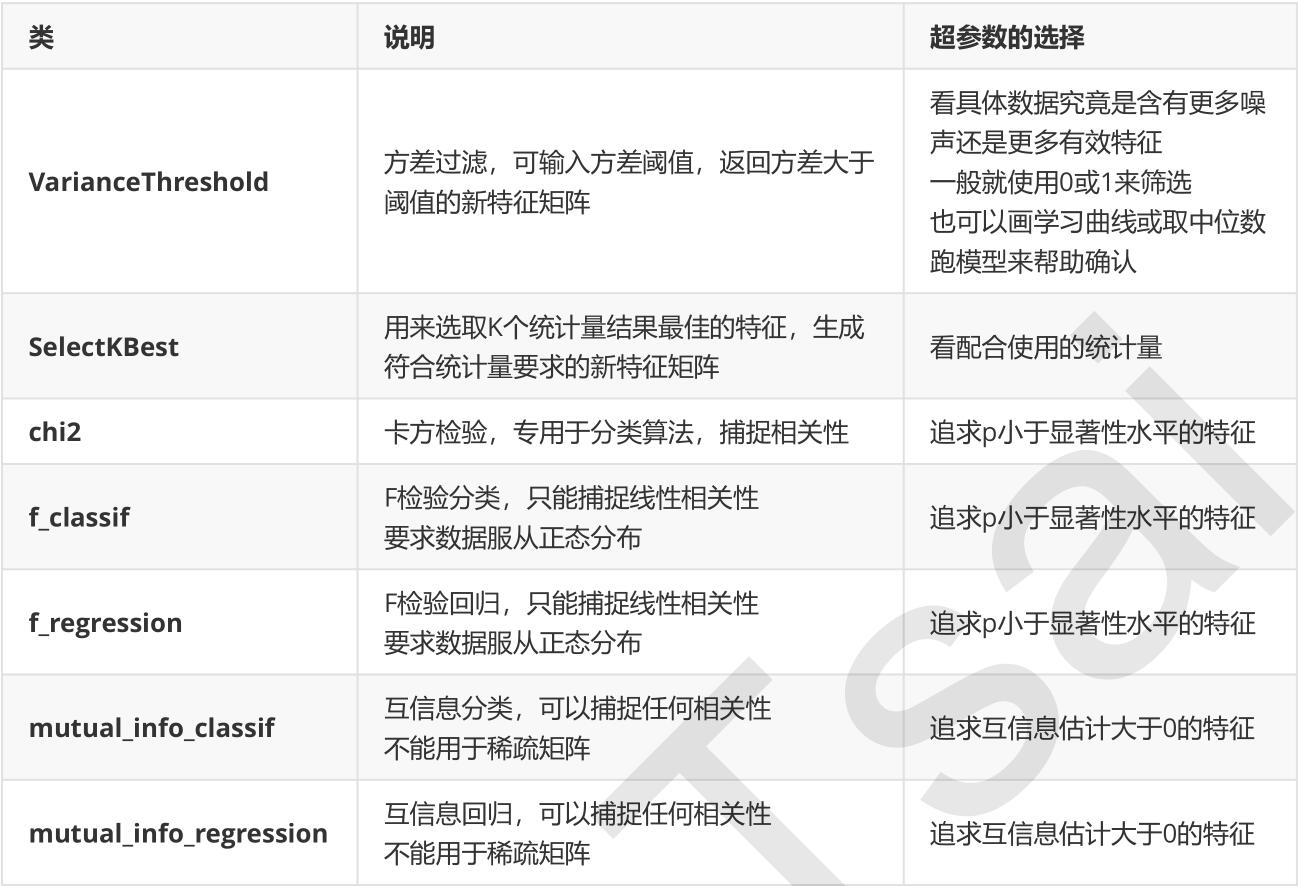 到这里我们学习了常用的基于过滤法的特征选择,包括方差过滤,基于卡方,F检验和互信息的相关性过滤,讲解了各个过滤的原理和面临的问题,以及怎样调这些过滤类的超参数。通常来说,我会建议,先使用方差过滤,然后使用互信息法来捕捉相关性,不过了解各种各样的过滤方式也是必要的。所有信息被总结在下表,大家自取: