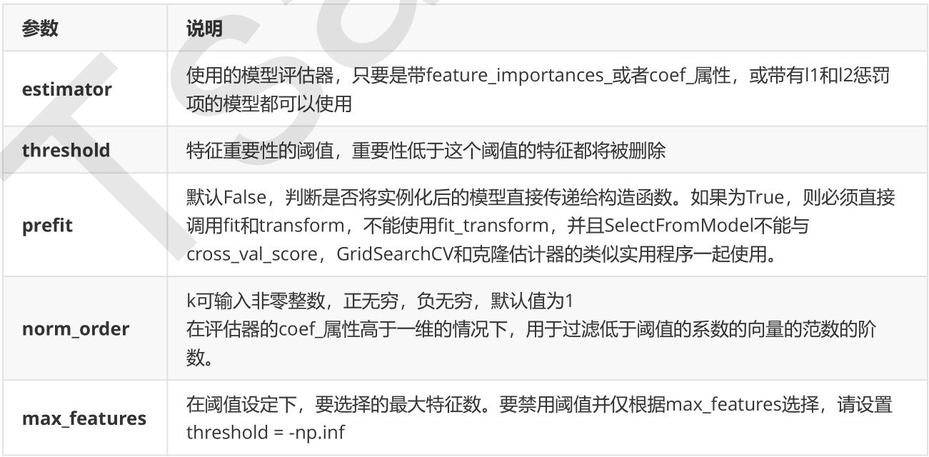 SelectFromModel是一个元变换器,可以与任何在拟合后具有coef_,feature_importances_属性或参数中可选惩罚项的评估器一起使用(比如随机森林和树模型就具有属性feature_importances_,逻辑回归就带有l1和l2惩罚项,线性支持向量机也支持l2惩罚项)。