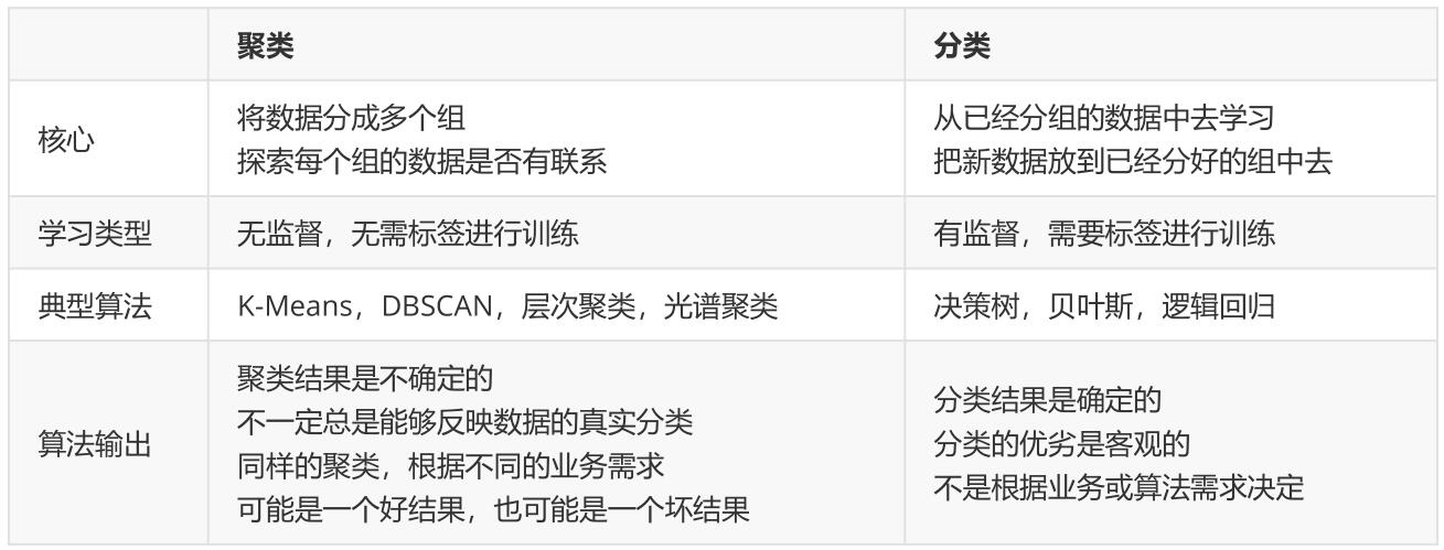 聚类算法聚出的类有什么含义呢?这些类有什么样的性质?我们认为,被分在同一个簇中的数据是有相似性的,而不同簇中的数据是不同的,当聚类完毕之后,我们就要分别去研究每个簇中的样本都有什么样的性质,从而根据业务需求制定不同的商业或者科技策略。这个听上去和我们在上周的评分卡案例中讲解的“分箱”概念有些类似,即我们分箱的目的是希望,一个箱内的人有着相似的信用风险,而不同箱的人的信用风险差异巨大,以此来区别不同信用度的人,因此我们追求“组内差异小,组间差异大”。聚类算法也是同样的目的,我们追求“簇内差异小,簇外差异大”。而这个“差异“,由样本点到其所在簇的质心的距离来衡量。
