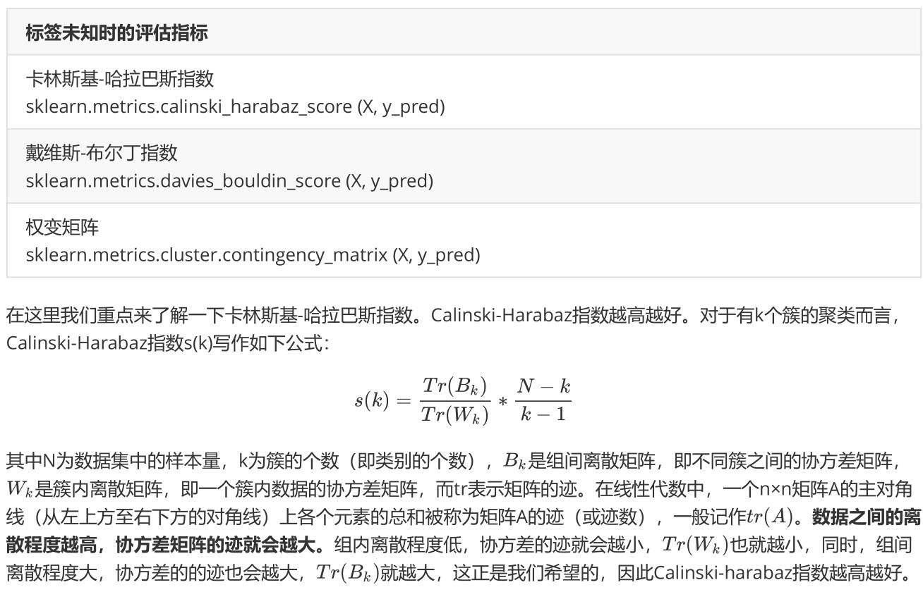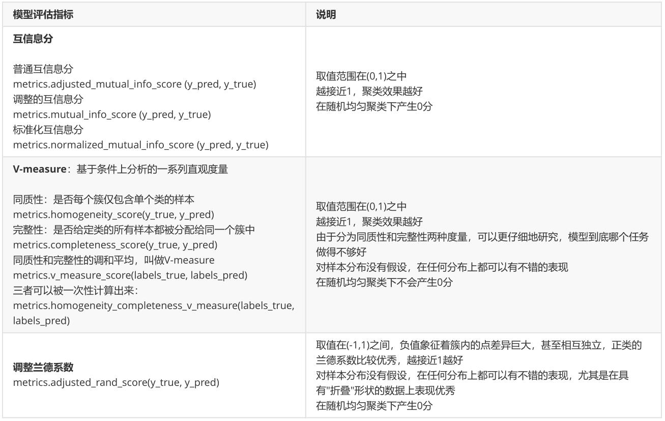 不同于分类模型和回归,聚类算法的模型评估不是一件简单的事。在分类中,有直接结果(标签)的输出,并且分类的结果有正误之分,所以我们使用预测的准确度,混淆矩阵,ROC曲线等等指标来进行评估,但无论如何评估,都是在”模型找到正确答案“的能力。而回归中,由于要拟合数据,我们有SSE均方误差,有损失函数来衡量模型的拟合程度。但这些衡量指标都不能够使用于聚类。