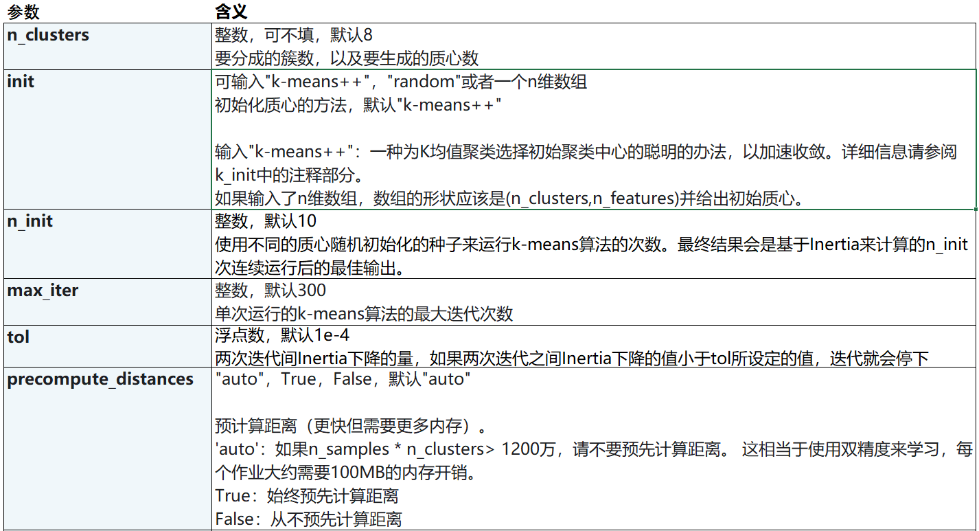 n_clusters是KMeans中的k,表示着我们告诉模型我们要分几类。这是KMeans当中唯一一个必填的参数,默认为8类,但通常我们的聚类结果会是一个小于8的结果。通常,在开始聚类之前,我们并不知道n_clusters究竟是多少,因此我们要对它进行探索。