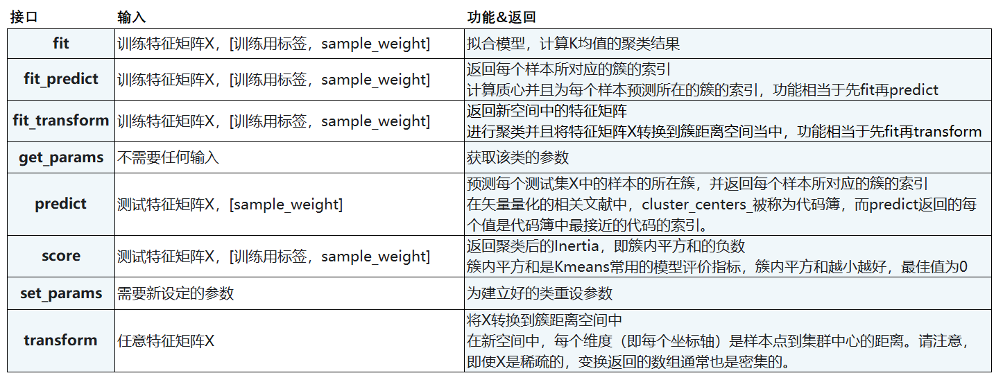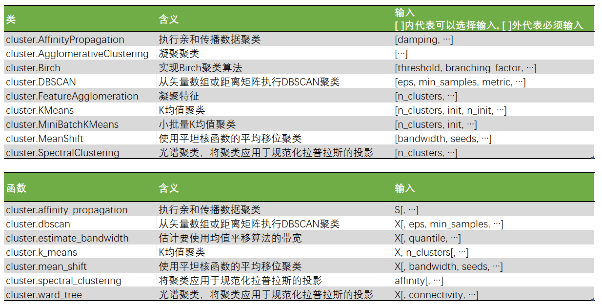 聚类算法在sklearn中有两种表现形式,一种是类(和我们目前为止学过的分类算法以及数据预处理方法们都一样),需要实例化,训练并使用接口和属性来调用结果。另一种是函数(function),只需要输入特征矩阵和超参数,即可返回聚类的结果和各种指标。