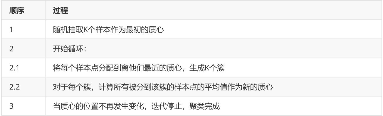 在KMeans算法中,簇的个数K是一个超参数,需要我们人为输入来确定。KMeans的核心任务就是根据我们设定好的K,找出K个最优的质心,并将离这些质心最近的数据分别分配到这些质心代表的簇中去。具体过程可以总结如下: