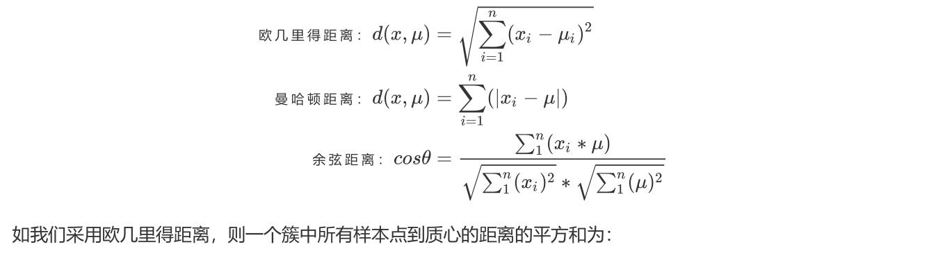 对于一个簇来说,所有样本点到质心的距离之和越小,我们就认为这个簇中的样本越相似,簇内差异就越小。而距离的衡量方法有多种,令 表示簇中的一个样本点,u 表示该簇中的质心,n表示每个样本点中的特征数目,i表示组成点 的每个特征,则该样本点到质心的距离可以由以下距离来度量: