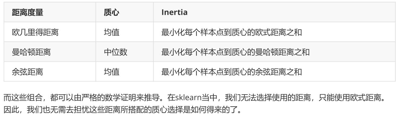 大家可以发现,我们的Inertia是基于欧几里得距离的计算公式得来的。实际上,我们也可以使用其他距离,每个距离都有自己对应的Inertia。在过去的经验中,我们总结出不同距离所对应的质心选择方法和Inertia,在Kmeans中,只要使用了正确的质心和距离组合,无论使用什么样的距离,都可以达到不错的聚类效果: