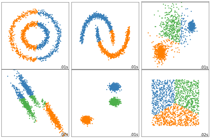 需要注意的一件重要事情是,该模块中实现的算法可以采用不同类型的矩阵作为输入。 所有方法都接受形状[n_samples,n_features]的标准特征矩阵,这些可以从sklearn.feature_extraction模块中的类中获得。对于亲和力传播,光谱聚类和DBSCAN,还可以输入形状[n_samples,n_samples]的相似性矩阵,我们可以使用sklearn.metrics.pairwise模块中的函数来获取相似性矩阵。
