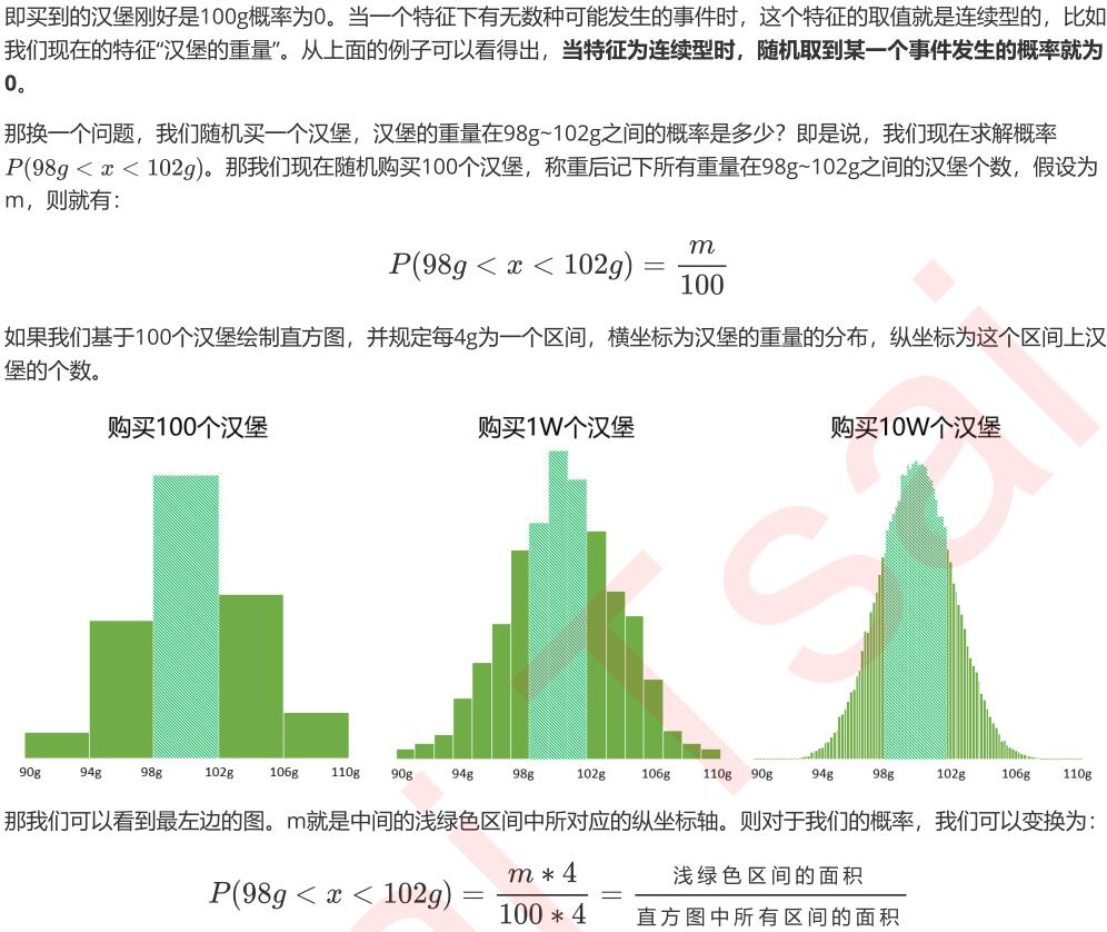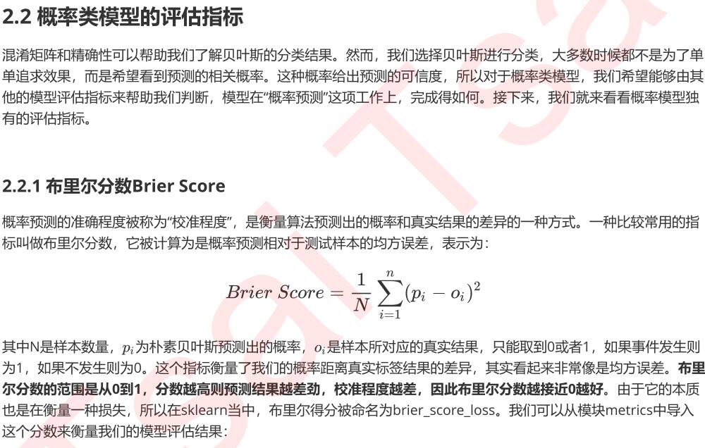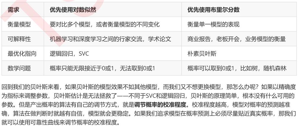 每种算法使用不同的指标来衡量这种可能性。比如说,决策树使用的就是叶子节点上占比较多的标签所占的比例(接口predict_proba调用),逻辑回归使用的是sigmoid函数压缩后的似然(接口predict_proba调用),而SVM使用的是样本点到决策边界的距离(接口decision_function调用)。但这些指标的本质,其实都是一种“类概率”的表示,我们可以通过归一化或sigmoid函数将这些指标压缩到0~1之间,让他们表示我们的模型对预测的结果究竟有多大的把握(置信度)。但无论如何,我们都希望使用真正的概率来衡量可能性,因此就有了真正的概率算法:朴素贝叶斯。