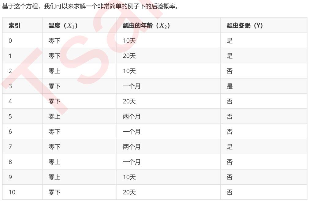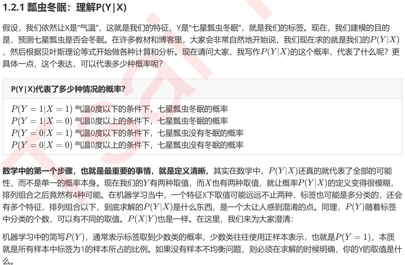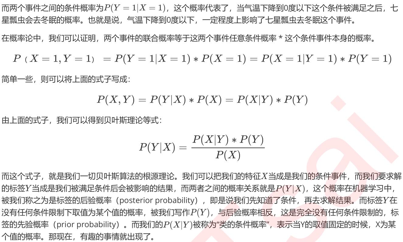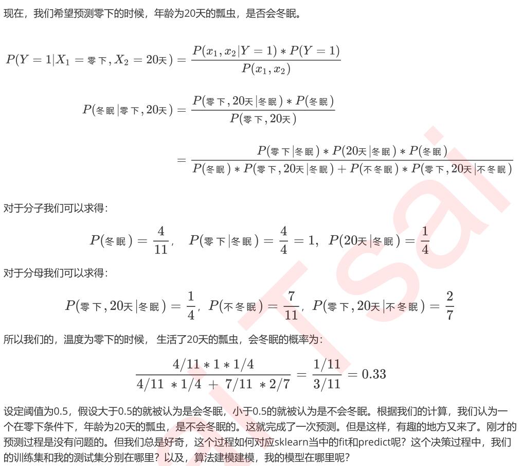 这说明,朴素贝叶斯是一个不建模的算法。以往我们学的不建模算法,比如KMeans,比如PCA,都是无监督学习,而朴素贝叶斯是第一个有监督的,不建模的分类算法。在我们刚才举的例子中,有标签的表格就是我们的训练集,而我提出的要求“零下的时候,年龄为20天的瓢虫”就是没有标签的测试集。我们认为,训练集和测试集都来自于同一个不可获得的大样本下,并且这个大样本下的各种属性所表现出来的规律应当是一致的,因此训练集上计算出来的各种概率,可以直接放到测试集上来使用。即便不建模,也可以完成分类。