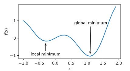 fig.axes.annotate('global minimum', xy=(1.1, -0.95), xytext=(0.6, 0.8),