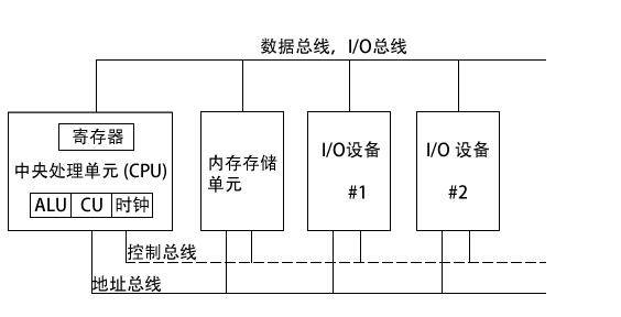 下图给出了假想机的基本设计。中央处理单元(CPU)是进行算术和逻辑操作的部件,包含了有限数量的存储位置——寄存器(register),一个高频时钟、一个控制单元和一个算术逻辑单元。