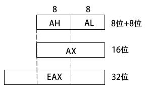 一些寄存器的组成部分可以处理 8 位的值。例如,AX 寄存器的高 8 位被称为 AH,而低 8 位被称为 AL。同样的重叠关系也存在于 EAX、EBX、ECX 和 EDX 寄存器中: