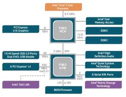 各种芯片组具有增强处理能力、多媒体功能或减少功耗等特性。以 Intel P965 Express 芯片组为例,该芯片组与 Intel Core2 Duo 或 Pentium D 处理器一起,用于桌面系统。