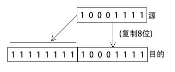 在三种形式中,第一个操作数(寄存器)是目的操作数,第二个操作数是源操作数。注意,源操作数不能是常数。下例将二进制数 1000 1111 进行全零扩展并传送到 AX: