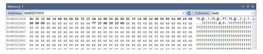 在内存窗口上端的 Address 栏里, 键入 & 符号和数组名称,然后点击 Enter。比如,&myArray 就是一个有效的地址表达式。内存窗口将显示从这个数组地址开始的内存块,如下图所示。