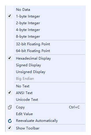 如果数组的值是双字,可以在内存窗口中,点击右键并在弹出菜单里选择 4-byte integer。还有不同的格式可供选择,包括 Hexadecimal Display,Signed Display(有符号显示),和 Unsigned Display(无符号显示)。下图显示了所有的选项。