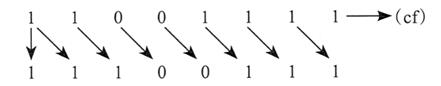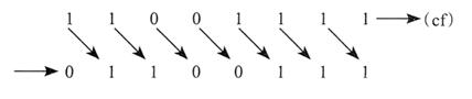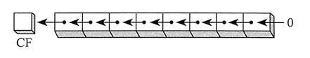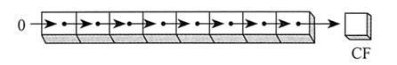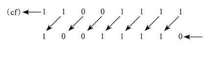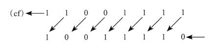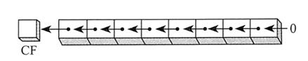 下图所示为二进制数 1100 1111 逻辑右移一位,得到 OllOOlll。最低位移入进位标志位: