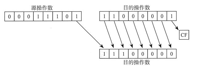 SHL(左移)指令使目的操作数逻辑左移一位,最低位用 0 填充。最高位移入进位标志位,而进位标志位中原来的数值被丢弃: