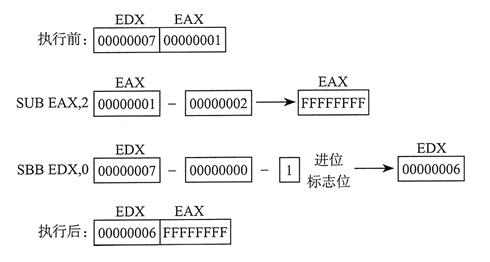32 位模式下,SUB 或 SBB 指令在 AL 中生成二进制结果,DAS(减法后的十进制调整)指令将其转换为压缩十进制格式。
