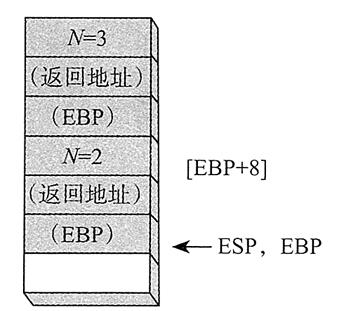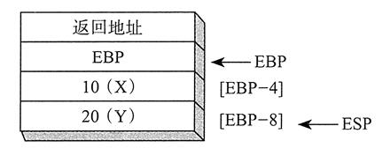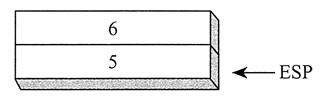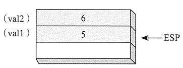 执行了上面两条指令后,堆栈帧的内容如下图所示。而形如 AddTwo(5, 6) 的函数调用会先把第一个参数入栈,再把第二个参数入栈: