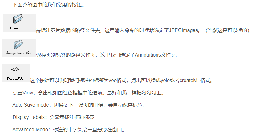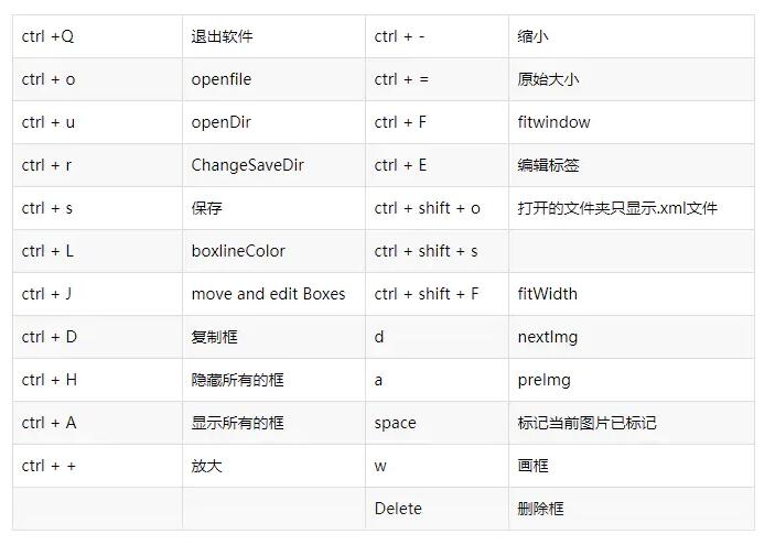 按键功能介绍 在labelImg窗口的左边功能键介绍: “Open”是打开单个图像, “Open Dir” 打开文件夹, “Change Save Dir” 图像保存的路径, “Next Image” 切换到下一张图像, “Prev Image”切换到上一张图像, “Verify Image”校验图像, “Save”保存图像, “Create RectBox”画标注框一个, “Duplicate RectBox”重复标注框, “Delete RectBox”删除标注框, “Zoom In” 放大图像, “Zoom Out” 缩小图像, “Fit Window”图像适用窗口, “Fit Width”图像适应宽度。 一组快捷键: