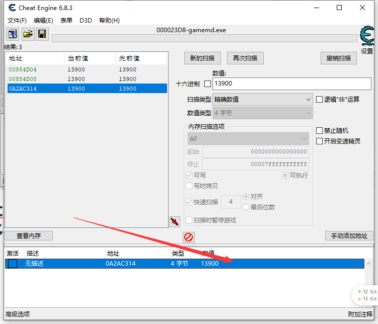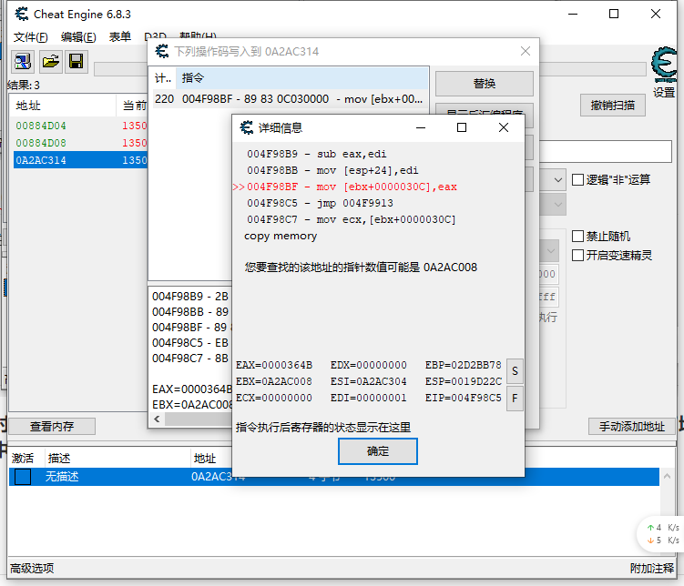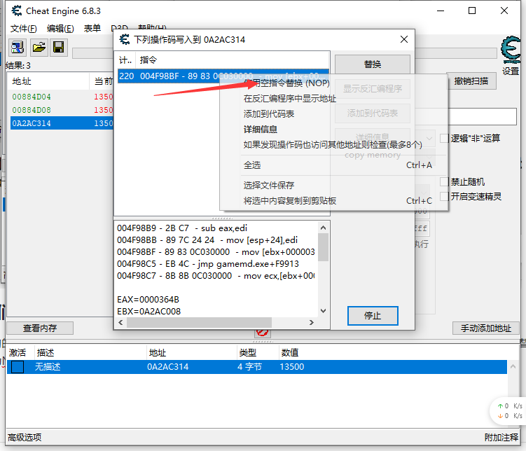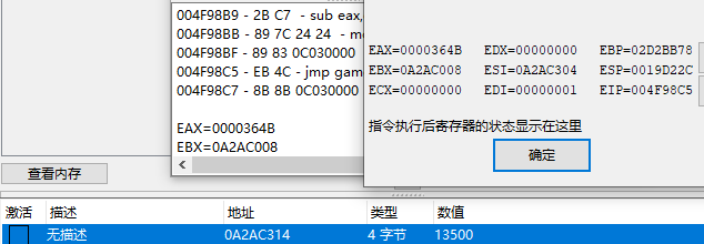 我们看ebx是0A2AC008他偏移30C以后是0A2AC314与我们抓到的这个内容完全一致说明没问题,此时数值为13500,我们目标是13900不变,我们改一下值就好啦。