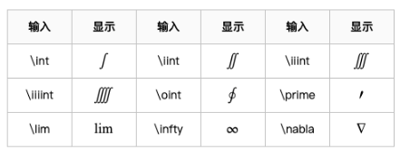命令:\int表示积分,\lim表示极限, \sum表示求和,\prod表示乘积,^、_表示上、下限
