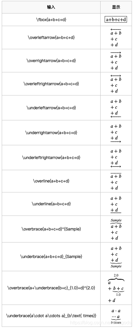 命令:\overline, \underline 分别在表达式上、下方画出水平线