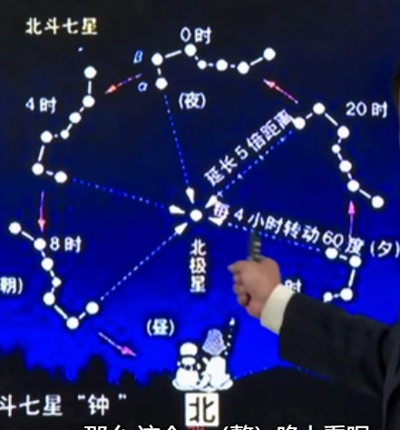 我们往北可以看到北斗星,对应往天上的方向就是南。变成了上南下北,左西右东。斗柄东指,天下皆春。斗柄南指,天下皆夏。斗柄西指,天下皆秋,斗柄北指,天下皆东。以此就有北斗七星历,根据斗柄指向判断春夏秋冬,原因是地球公转的原因,这个效应让恒星每天早升起4分钟。日积月累造成星空的变化。注意能否看到恒星需要结合当地维度进行辨析。