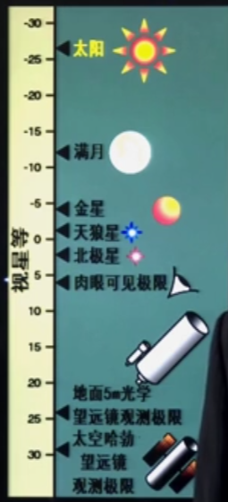 19世纪进行精确定量化:规定1等星比6等星亮100倍,比1等星更亮的有0等、-1等星,比如天狼星-1.43(肉眼可见最亮的恒星除了太阳)比6等星更暗的有7等星、8等星得益于天文望远镜的发展。