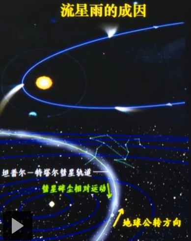 彗星运动洒下碎屑,地球公转经过彗星轨道的碎屑,地方呢也恰好固定,往特定的方向望去对应的星座也基本不变,碎屑进入地球大气层开始燃烧就成了流星雨。不过我们看的时候如果进入地球的话,然后迎面过来应该是平行线,参考透视的原理可以解释为什么流星雨过来的时候的方向不平行。