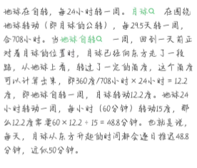 月亮每月(29.5天)要向东公转360度,平均每天东移58度多,而新月时日月在同一直线,每天偏东58度,每天就比太阳晚出来52分钟(15度1个小时)。