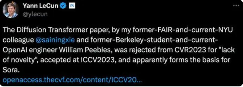 - Scalable Diffusion Models with Transformers(中稿 ICCV 2023,据悉这是 Sora 背后的核心技术之一,它将 Diffusion 模型与 Transformer 结合起来。Diffusion Model 最初由德国慕尼黑大学提出,据 Meta 的 AI 科学家 Yann LeCun 透露,Sora 的这项基础研究 DiT 曾在 CVPR 2023 的审稿过程中被认为“缺乏创新性”而遭拒稿。然而,这并不影响 Sora 在发布后的短短几天内获得的广泛关注和成功。)