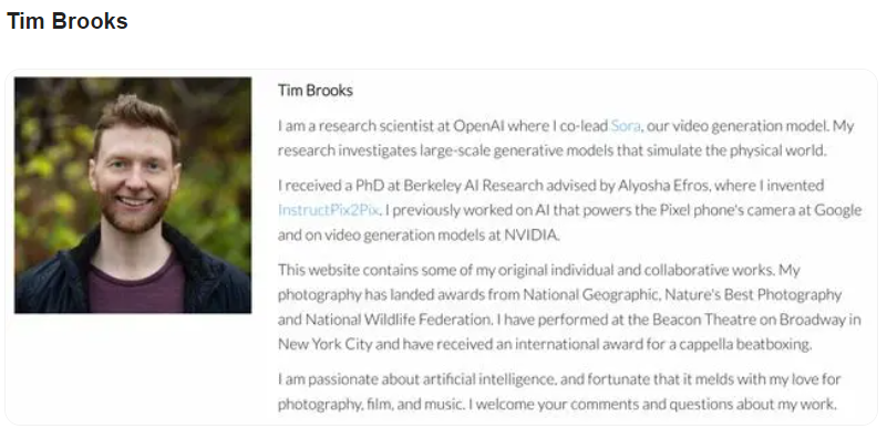 由此可见,Tim 是个妥妥的文艺青年,而 Sora 的诞生,也少不了他在摄影、影片和音乐方面的兴趣驱动。