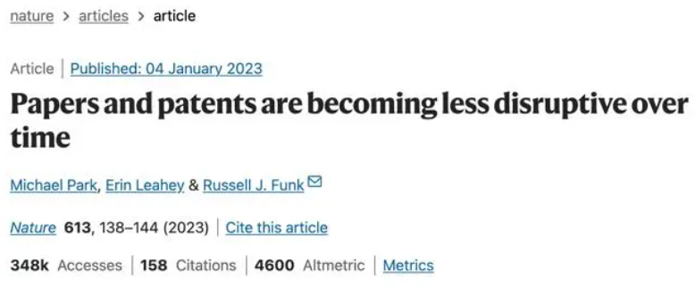去年,《Nature》杂志上发表的一篇文章指出,“近年来科研论文数量激增,却缺少颠覆性创新”,研究人员跨越多个学科,通过分析数十年来科技成就的创新动态指数趋势,旨在评估研究成果在颠覆性方面的整体变化。然而结果显示,论文和专利更倾向于深化既往研究,而非开拓新的领域。