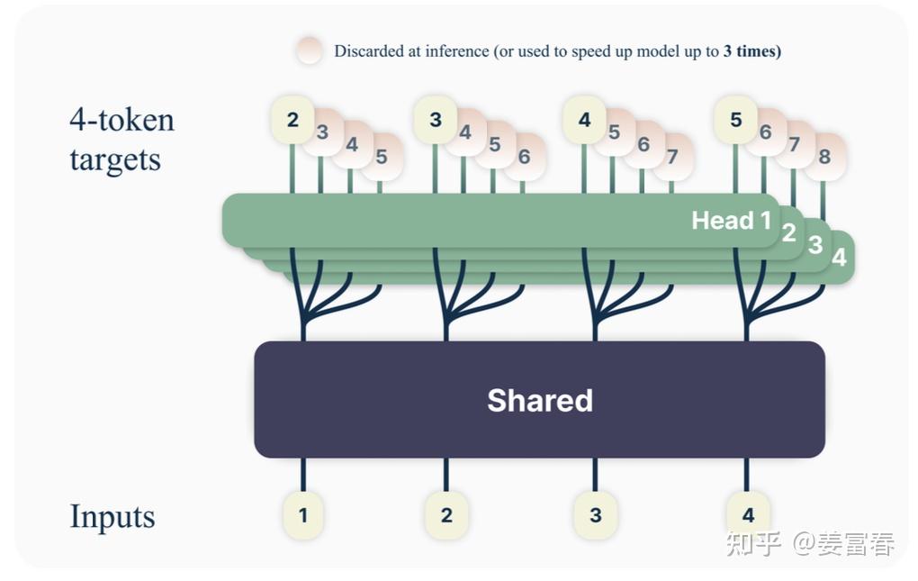 - 训练阶段:通过预测多步token,迫使模型学到更长的token依赖关系,从而更好理解上下文,避免陷入局部决策的学习模式。同时一次预测多个token,可大大提高样本的利用效率,相当于一次预估可生成多个<predict, label>样本,来更新模型,有助于模型加速收敛。