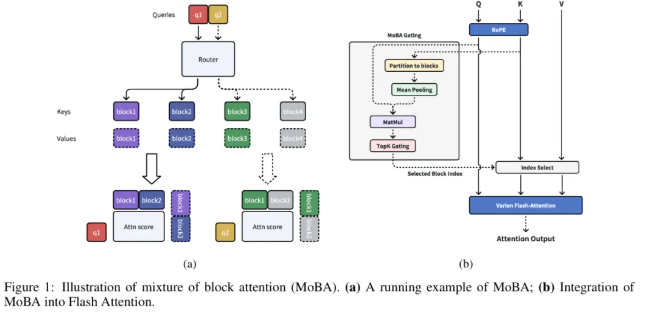 MoBA 方法的解决思路是,既然只想让 q 去匹配一部分 k 和 v,那么就先给整个序列长度的位置划分为许多个相同大小的 block,先去匹配计算 q 和哪些 block 更加相关,抛弃哪些不怎么相关的信息。