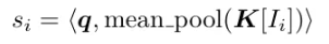 然后,就是要让 q 和剩余的每一个 block 做一次相关度关联,把那些相关度高的找出来,丢弃相关度底的。具体操作就是让每一个 block 都做一遍 mean pooling,然后让 q 和这个 mean pooling 做内积,就会得到一个关联度值,写成公式就是下面这样。我是用语言表述哈。