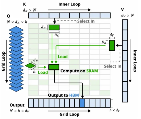 当然,Deepseek 还基于 Triton 对硬件加速 qkv 操作做了详细的阐述:这幅图展示了在存储上,是如何操作注意力机制的。