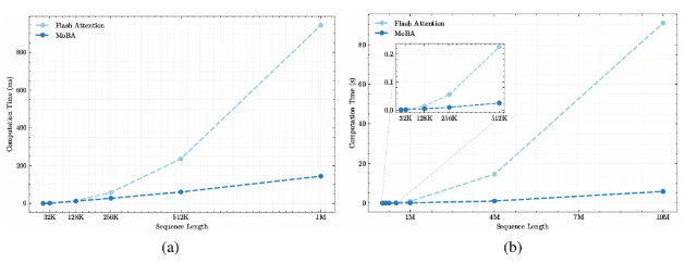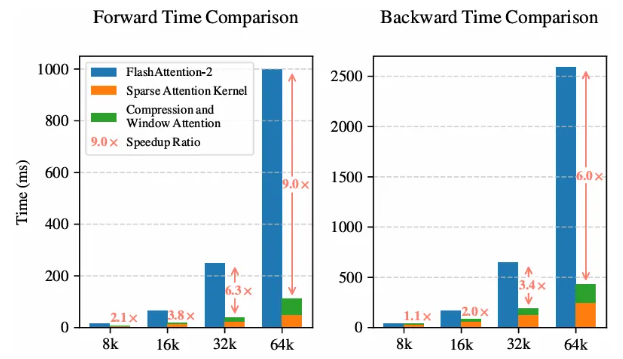 两者都展现了 Sparse Attention 的优越性,都是在和 Flash Attention 作比较,都比 Flash Attention 快得多。实验上各有优劣。Kimi 尝试的长度达到了 100万,而 Deepseek 则是分前向传播和反向传播做了对比试验。