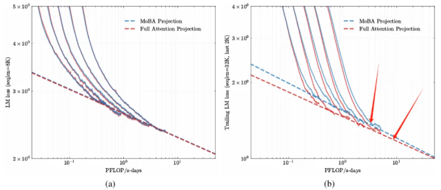 先说 Kimi,既然只选取了部分关联度高的 block 来做注意力计算,那么肯定就丢失了一部分信息,即便那部分信息量再少,肯定多少还是丢失了,会对最终结果有影响,效果如图所示:可以看出蓝色 MoBA 线比红色线高一些,代表损失值更高。不过,随着训练加深,蓝色线再逐渐逼近红色线。这说明理论上 Kimi 的 block selection 方法是可以达到理论最佳,追上 full attention 的。