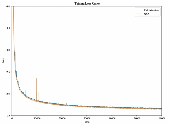 这里,Deepseek 的 NSA 方法损失值比 full attention 还略微低了一丢丢。